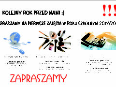 ZAPRASZAMY na pierwsze zajęcia I i II rok na kierunku Technik Rachunkowości i Technik Usług Kosmetycznych w dniu 14 września 2018 r. w budynku I Liceum Ogólnokształcącego. Zajęcia rozpoczną się...
